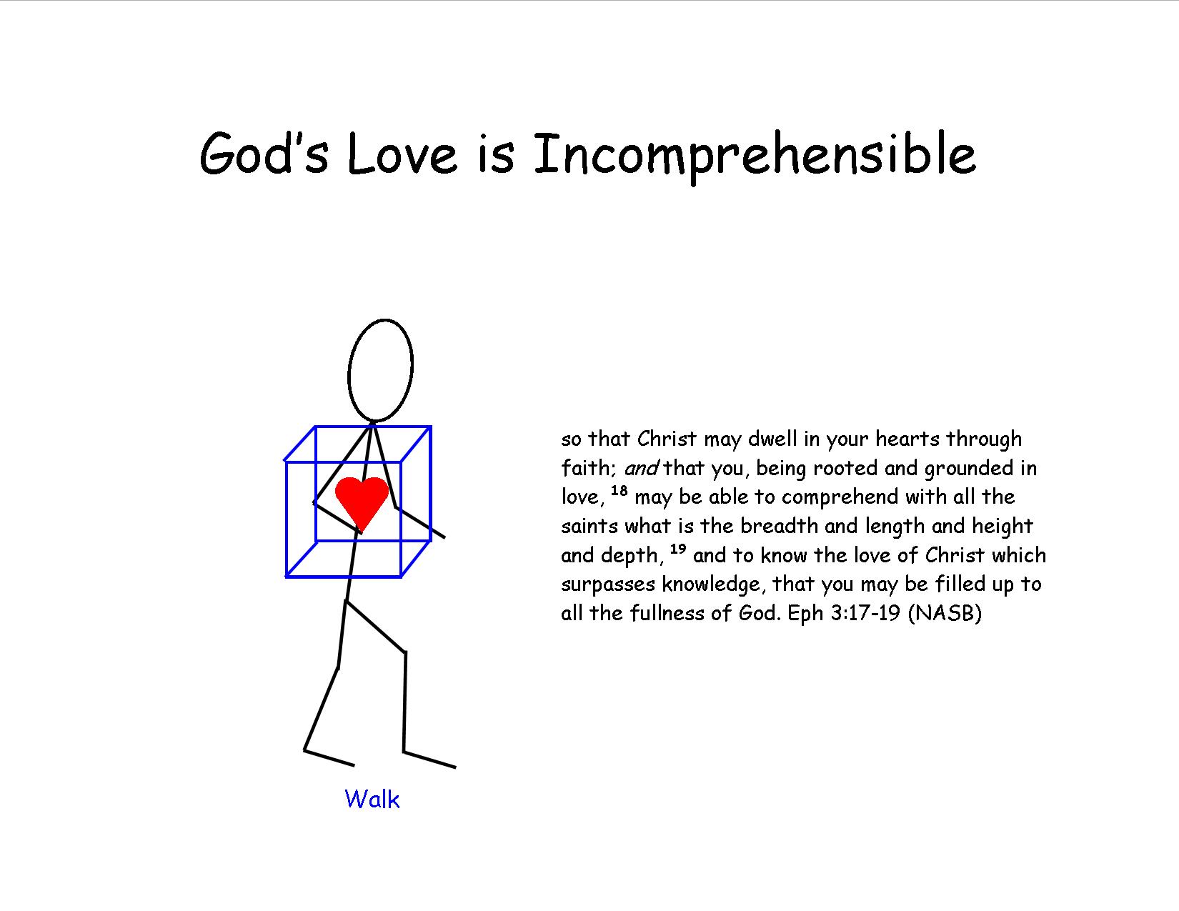 “For this reason I bow my knees before the Father, 15 from whom every family in heaven and on earth derives its name, 16 that He would grant you, according to the riches of His glory, to be strengthened with power through His Spirit in the inner man, 17 so that Christ may dwell in your hearts through faith; and that you, being rooted and grounded in love, 18 may be able to comprehend with all the saints what is the breadth and length and height and depth, 19 and to know the love of Christ which surpasses knowledge, that you may be filled up to all the fullness of God. 20 Now to Him who is able to do far more abundantly beyond all that we ask or think, according to the power that works within us, 21 to Him be the glory in the church and in Christ Jesus to all generations forever and ever. Amen” Eph 3:14-21 (NASB).