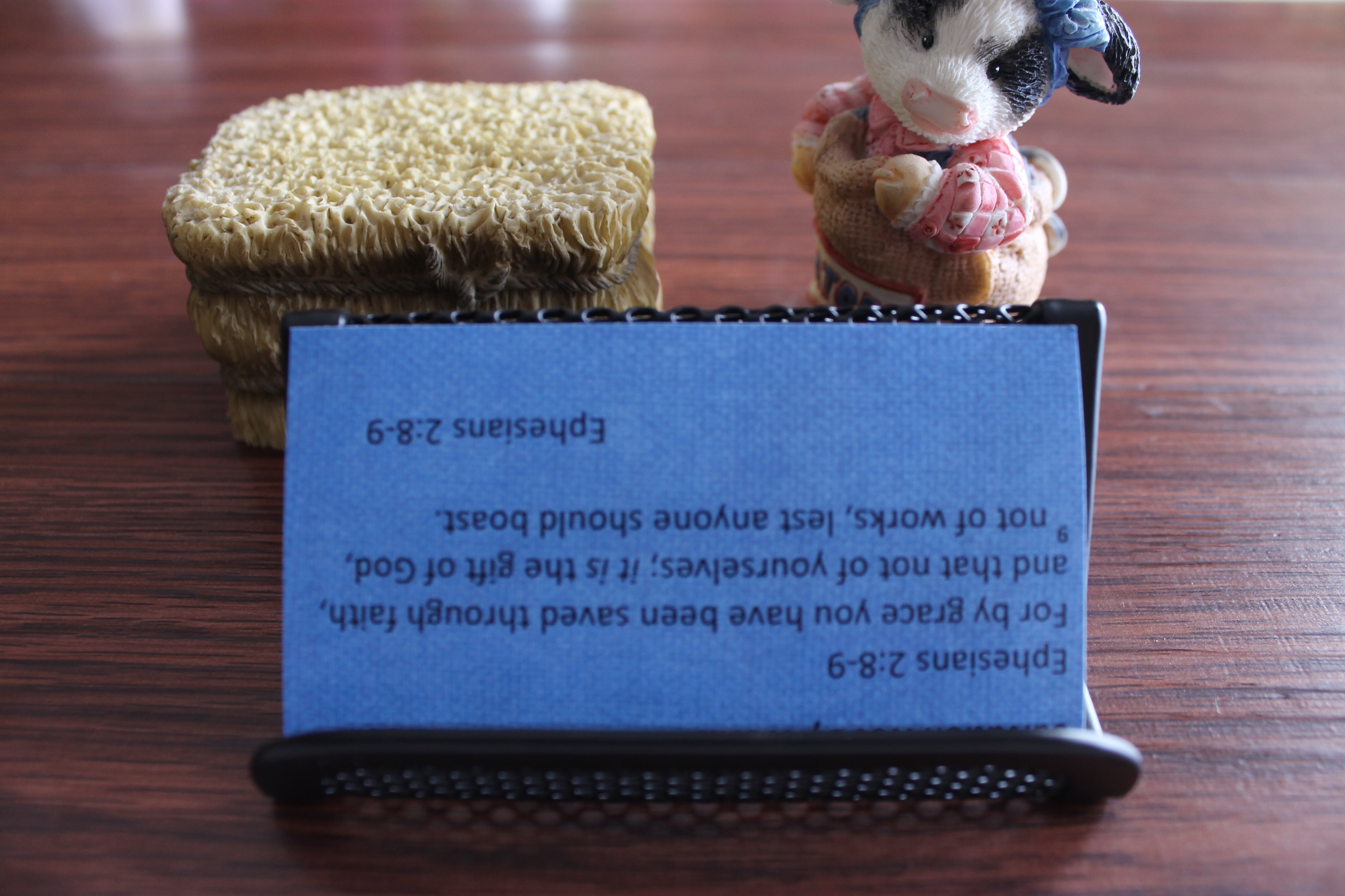I have never been very motivated to memorize scripture until I started this blog. My intentions have always been good, but laziness has always won out. I now have a great method for memorizing scripture, which has worked wonders for me. Sorry, I don’t have a magical way to make memorization easier, but I have come up with a method which is working for me. I have typed scripture verses using Word’s business card templates and printed them out. I bought a cute business card holder and have placed them at my dinner table. During breakfast and lunch, I work on my scripture memory. I am amazed at how many verses I have learned from my Memory Verse Monday posts. Here is a picture of my memory verse cards: