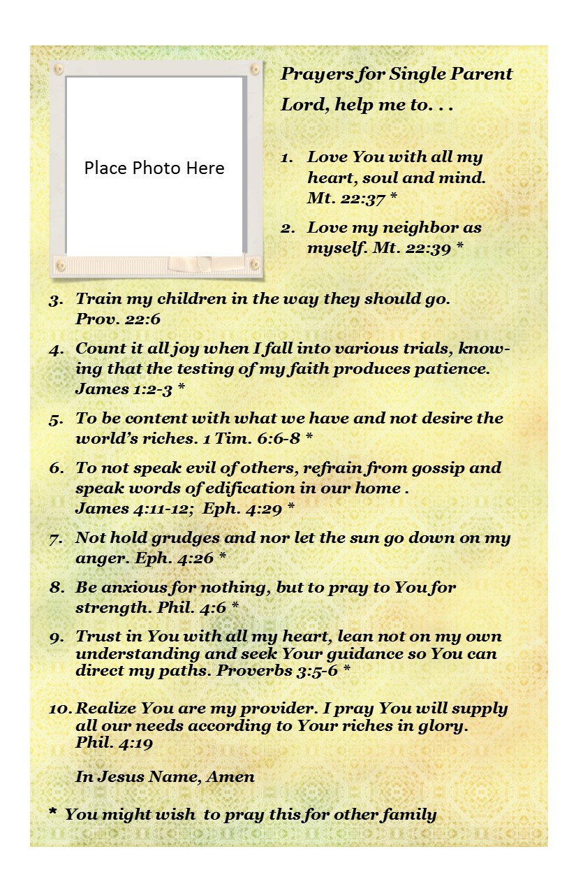 It is our first “10 Prayers Tuesday”. If you missed my post from yesterday, we have a new summer schedule, Summer in the Secret Place, that you might wish to check out at Prayer in Every City. This summer we will be studying the book of 1 John and making Family Photo Prayer Journals. Even if you are not the crafty type, I promise that these journals are simple to make. Just read the instructions on how to make the Family Photo Prayer Journal, but most importantly establish a quiet time with the Lord. Today’s post is for Single Parents. Even if you are married, please consider printing this out and praying for a single parent whom you know. With the divorce rate in America at 50%, we have many single parents who need prayer.