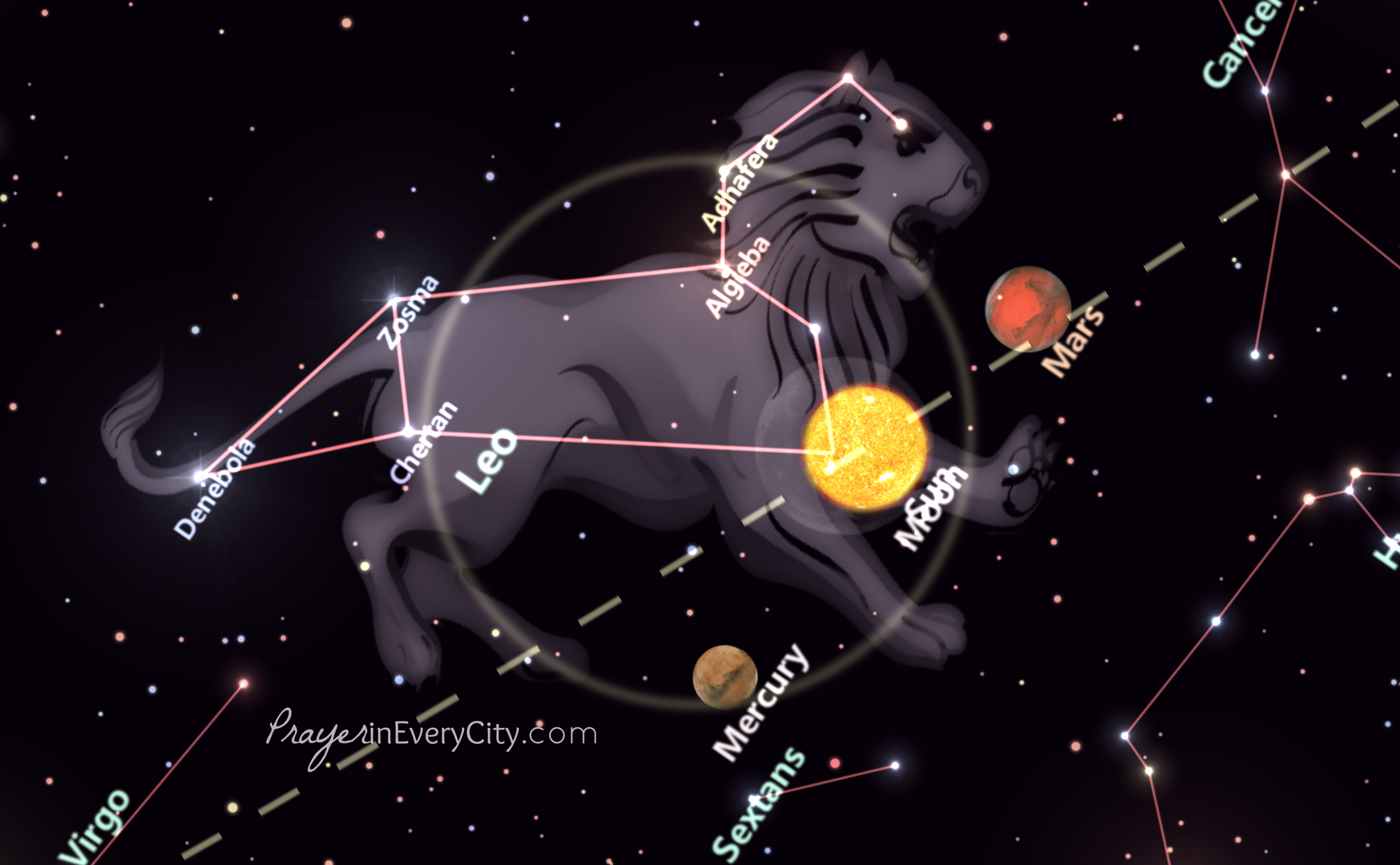 Notice that the Sun and Moon are overlapping near the constellation of Leo the Lion. Even though you cannot read the name, the sun and moon are over the star Regulus, which is the regal or king star. So the sun and moon are lining up with the king constellation on top of the king star. This is fascinating to me, because Jesus is the Son (Sun) of God and is referred to as the Lion of the Tribe of Judah. The Son is in alignment with the King Star, Regulus, but this is not the total story.