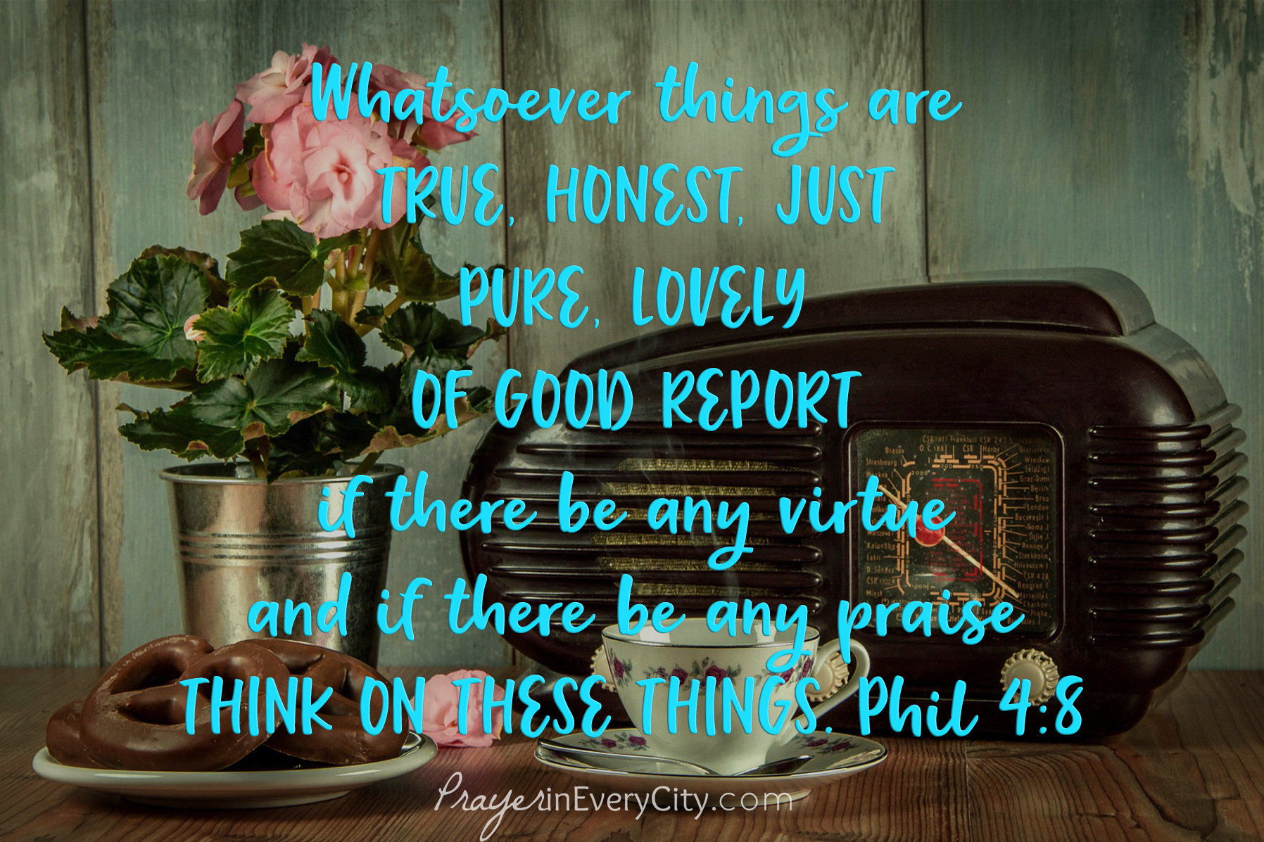 Yesterday we talked about what happens when we are anxious. We can only have peace in our lives when we learn how to take our problems to the Lord and leave them there. So if we are not supposed to think about thoughts that cause anxiety, what should we think about? The apostle Paul tells us in verse 8. Answer the following questions in your journal. You will want to write it down so you don’t forget this important truth.
